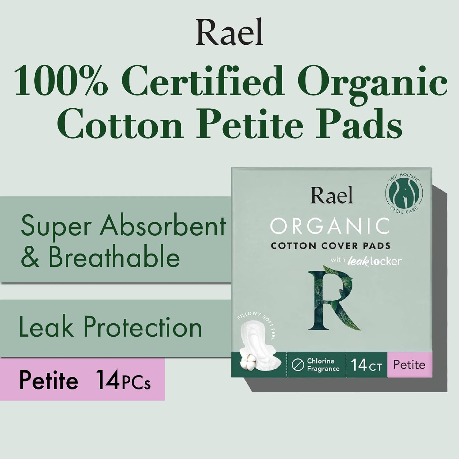 Pack of 1 x Rael, Organic Cotton Cover Pads, Petite, 14 Pads. Our Story Rael was created for women by women. We are committed to sourcing the highest quality ingredients, developing innovative products, and offering easy access to healthy alternatives for women around the world. Why Rael? Organic cotton pads that actually work. 100% Organic Cotton Top Sheet - OCS certified organic cotton - Texas organic cotton Super Absorbent Core - Prevent leaks - Sustains freshness all day Maximum Airflow - Hypoallergenic, soft, and breathable - Non-toxic adhesive for sensitive skin Leak Locker Technology - Uniquely-designed to trap fluids - Side panels for added security Made Without fragrance, chloride, pesticides, artificial dyes, toxic adhesives, acetone, styrene, chloroform, chloromethane, chloroethane, GMOs, rayon, polyester, and other toxic ingredients. Suggested Use Remove peel strip and place pad on underwear. Fold wings around the edge. 100% certified organic cotton cover. To avoid suffocation, keep this bag away from children. Some manufacturing changes to packaging and / or ingredients may be pending update meaning items may occasionally be dispatched with alternate packaging.
